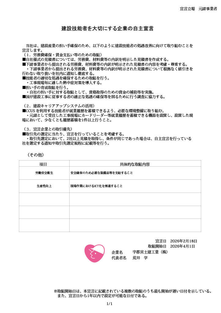 建設技能者を大切にする企業の自主宣言をいたしました。